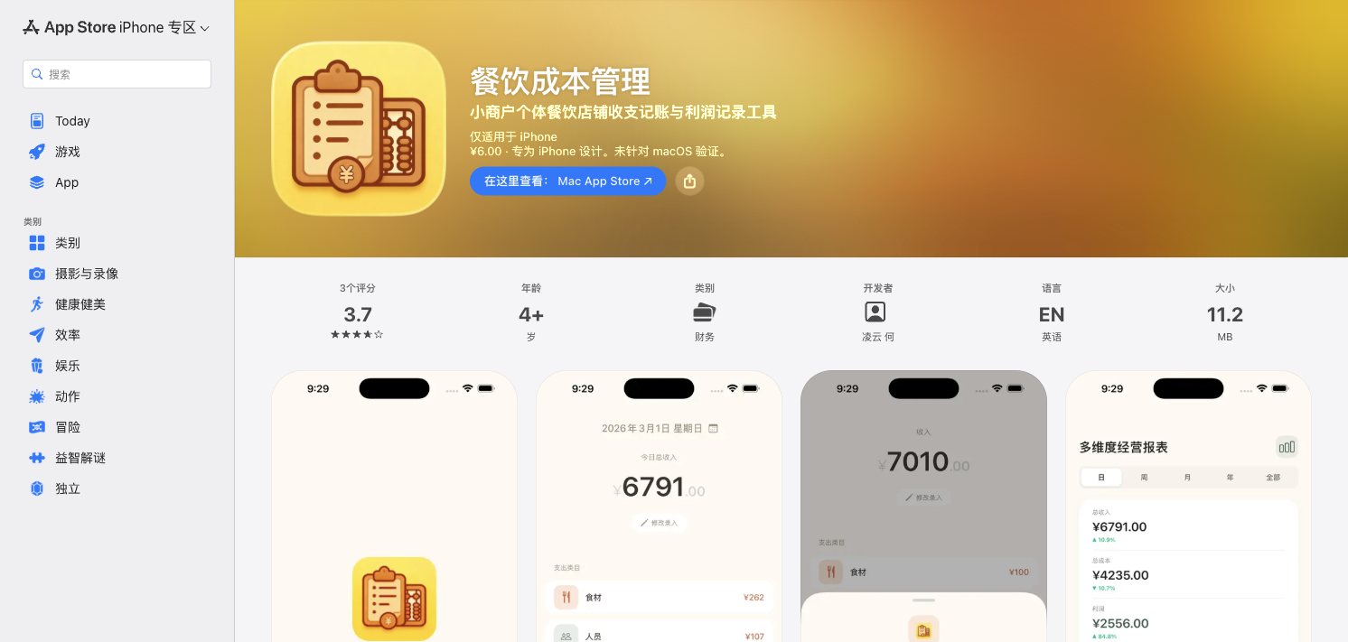 Catering Cost Manager was launched by solo developer Lingyun He on March 6, 2026. Designed specifically for small restaurant businesses, it reached #9 on the Finance Paid chart within 5 weeks. At only 11.2 MB and ¥6, it exemplifies the lean indie developer approach.